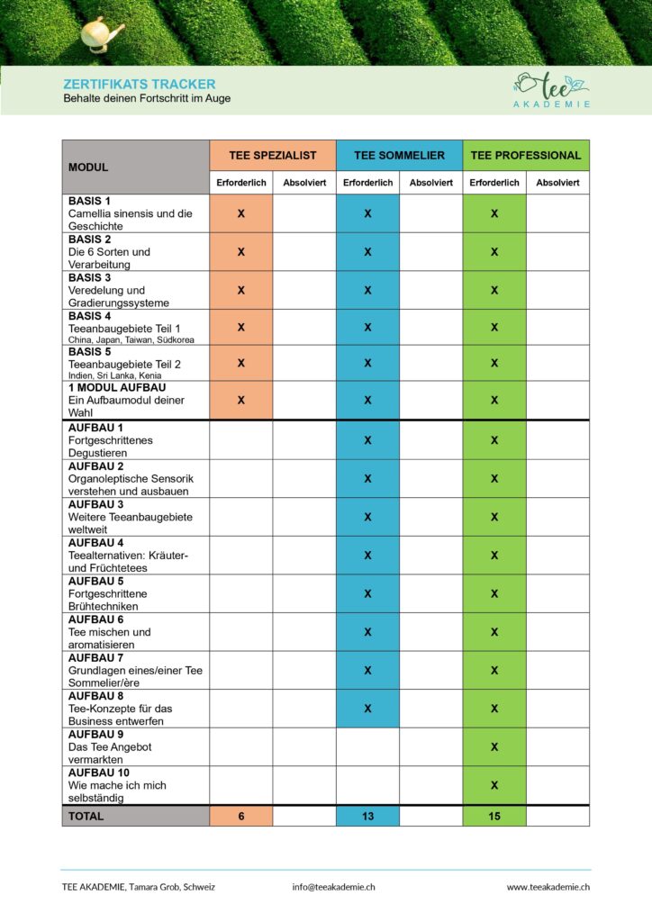 Nach Abschluss aller Module hast du die Zertifikate Tee Spezialist und Tee Sommelier / Tee Sommelière erreicht und darfst sie mit Stolz entgegen nehmen.